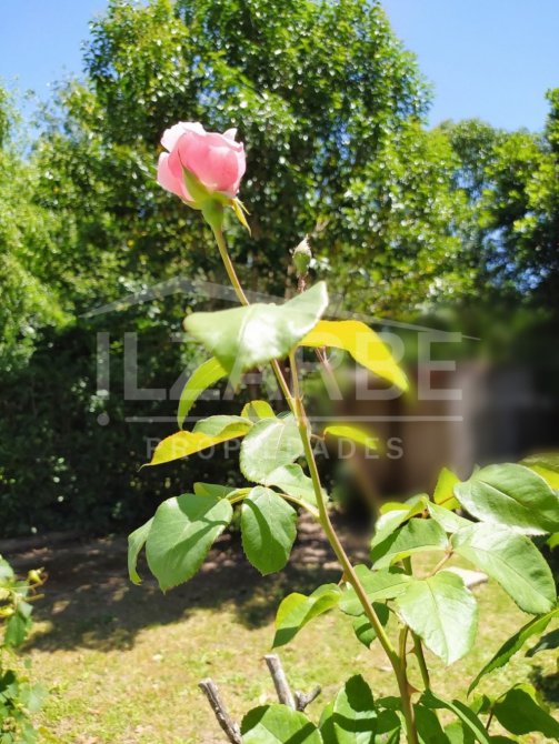 Con respecto al exterior, cuenta con amplio patio delantero y trasero, que se conectan por un pasillo (en uno de sus extremos), y posee numerosas plantas y arboles.
