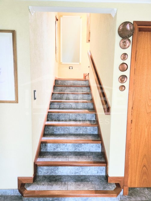 Posteriormente, ingresando ya a la vivienda, se haya un hall de entrada. A patir de ahí, se puede seguir derecho (por una escalera) a la planta alta, o girar al ala izquierdo o derecho. En el último mencionado, se encuentra un luminoso living (con estufa a leña; aire acondicionado; calefacción central, como en el resto de la casa).