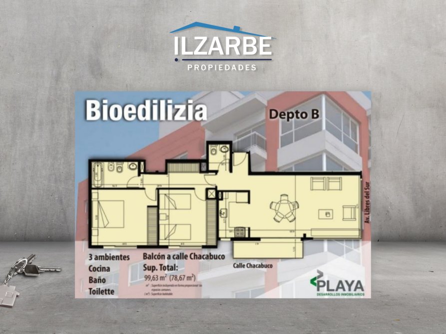 Moderno departamento en esquina (Chascomús - Edificio Bioedilizia); ubicado sobre la calle Libres del Sur 348, en segundo piso (2 "B"). En pleno centro de la ciudad, en frente a la Plaza Sarmiento. Diseñado para utilizar energías alternativas y contribuir con el medioambiente (ej: con paneles solares). Puntualmente, posee un sistema solar térmico y un " fotovoltaico. Y la calefacción es por medio de losa radiante.