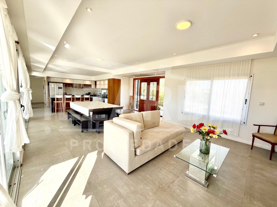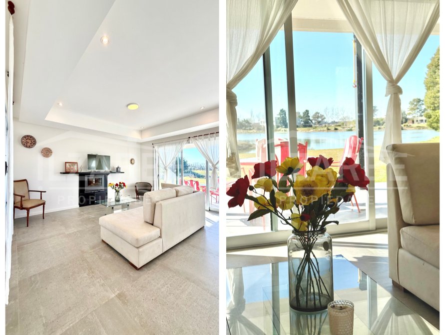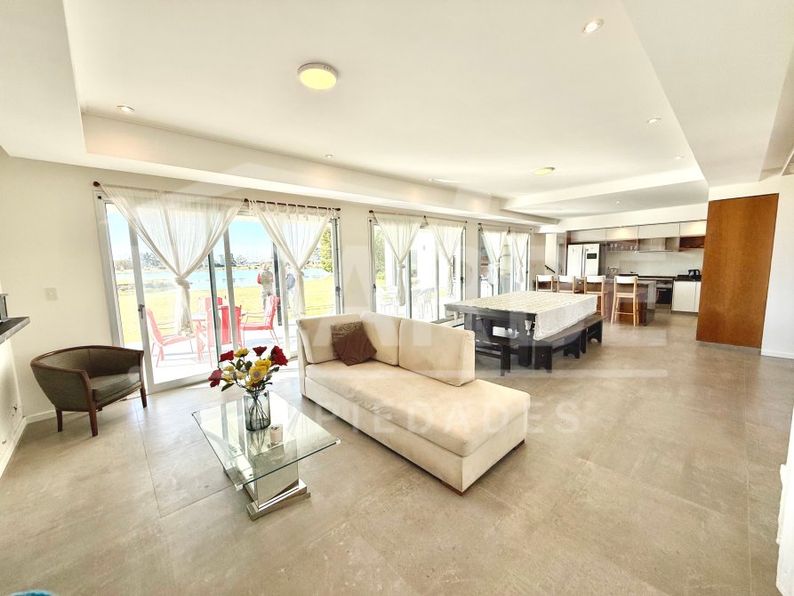 Al abrir la puerta principal, se encuentra un amplio y luminoso living-comedor. Con vistas al Lago, gracias a que la pared que da hacia el mismo (orientación este), esta casi toda vidriaria (con puertas ventanas de aluminio). E iluminación embutida.