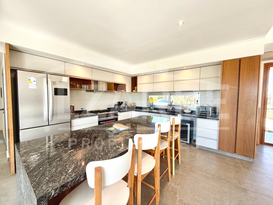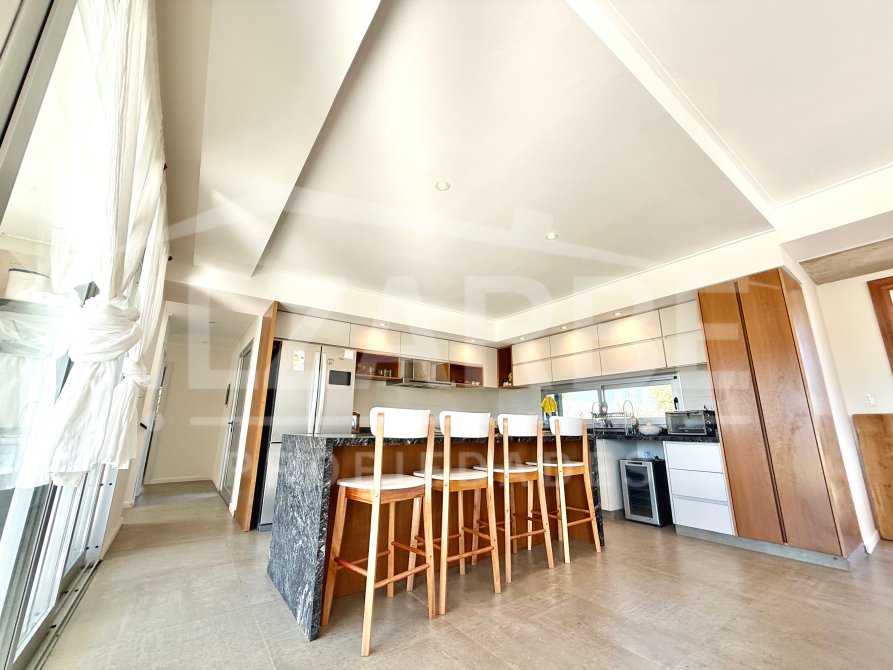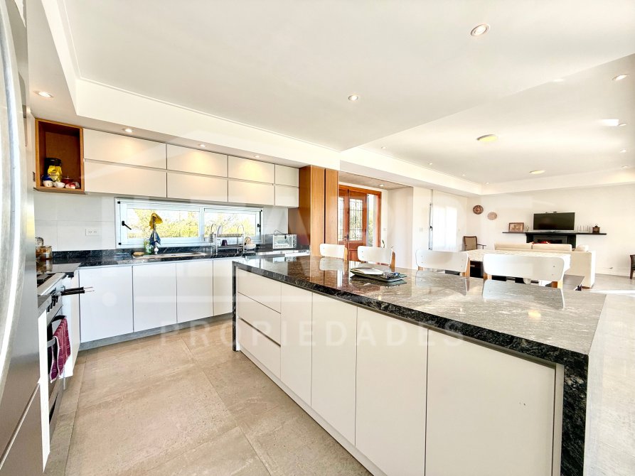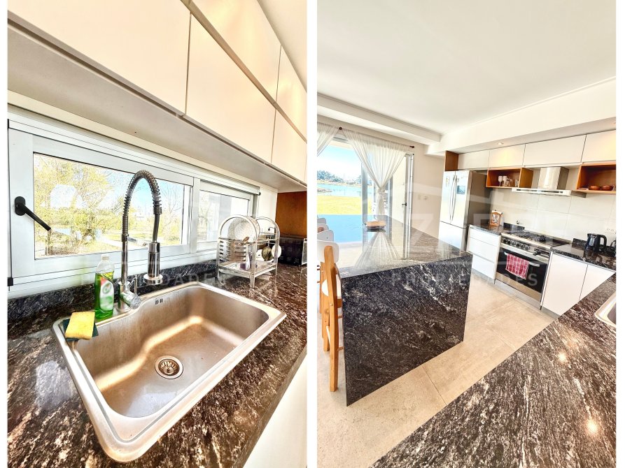 Por otro lado, cuenta con una amplia cocina de diseño moderno, equipada con una gran isla central revestida en piedra natural oscura, ideal como desayunador o comedor diario. Dispone de amoblamiento laqueado de líneas puras, que combina tonos neutros con detalles en madera natural, aportando calidez al ambiente. Se completa con alacenas y bajo mesadas que optimizan el espacio de guardado.
