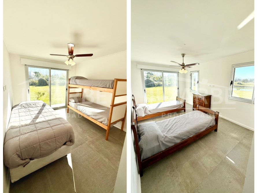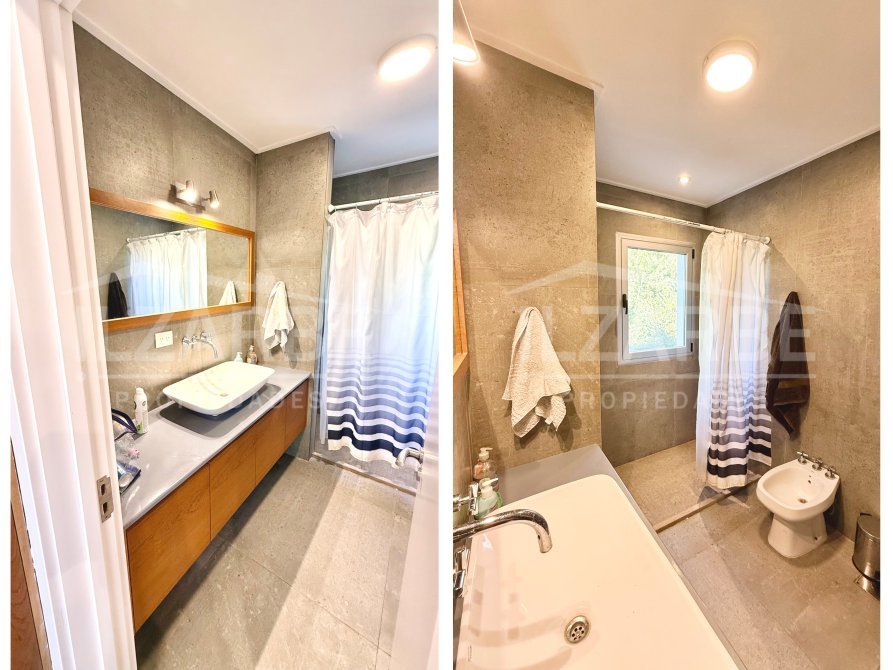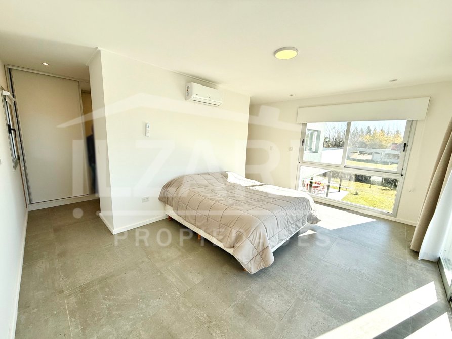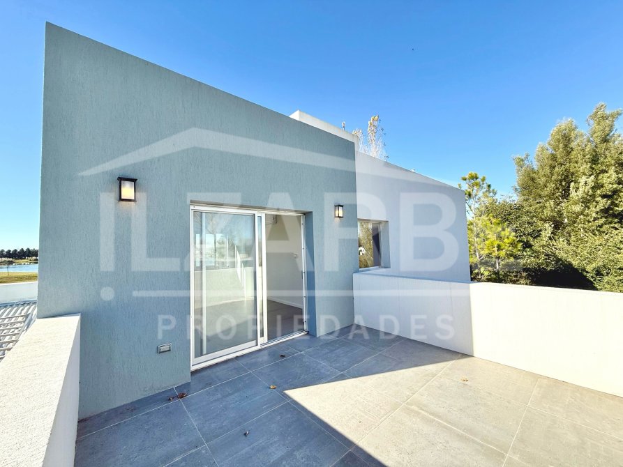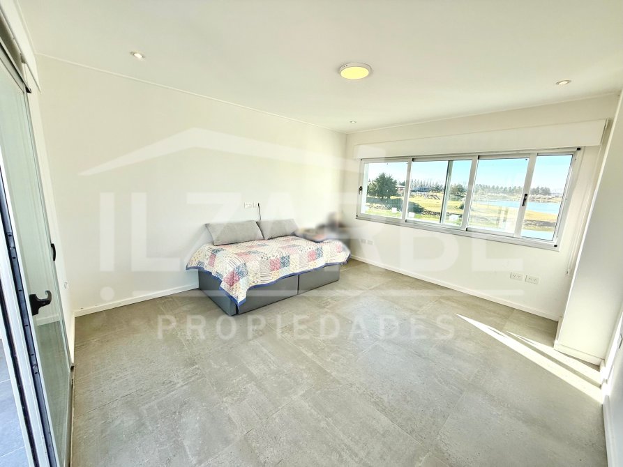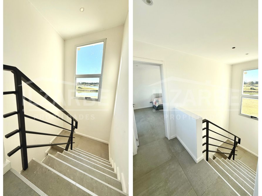 Continuando por la planta alta, a la cual se accede mediante una escalera con descanso, se encuentran los otros dos dormitorios (sumando un total de 4 dormitorios). Por un lado, un dormitorio con aire acondicionado y balcón/terraza propia con orientación Oeste (hacia la calle). Por el otro, una suite principal que incluye: antebaño con lavatorio de apoyo marca Piazza, bajo mesada y placard de guardado; baño completo, equipado con lavatorio línea Ferrum, bidet, inodoro y ducha; vestidor con placares enfrentados a ambos lados; aire acondicionado; balcón/terraza privado con vistas abiertas al lago y la laguna.