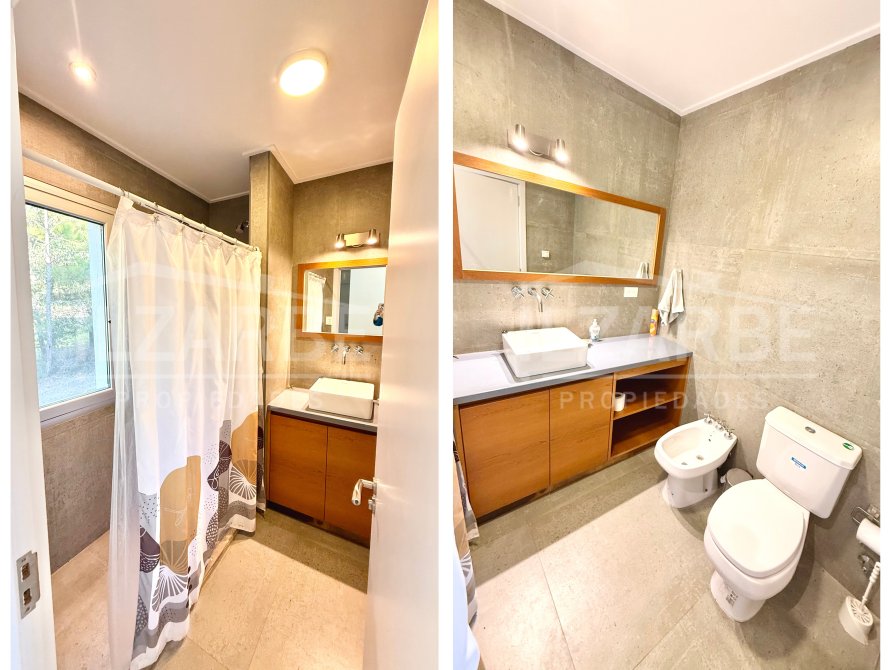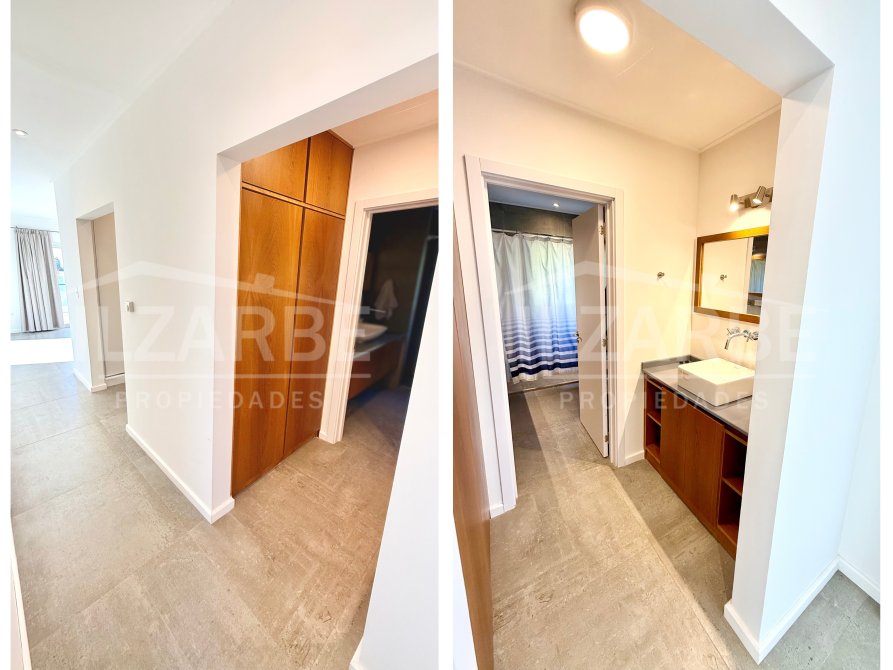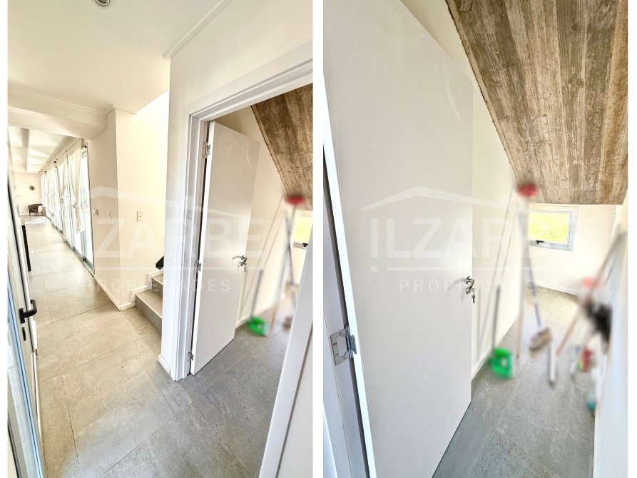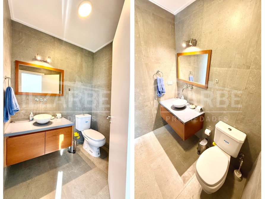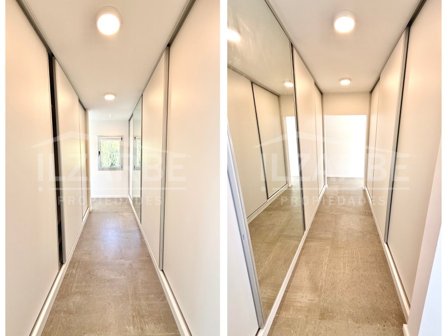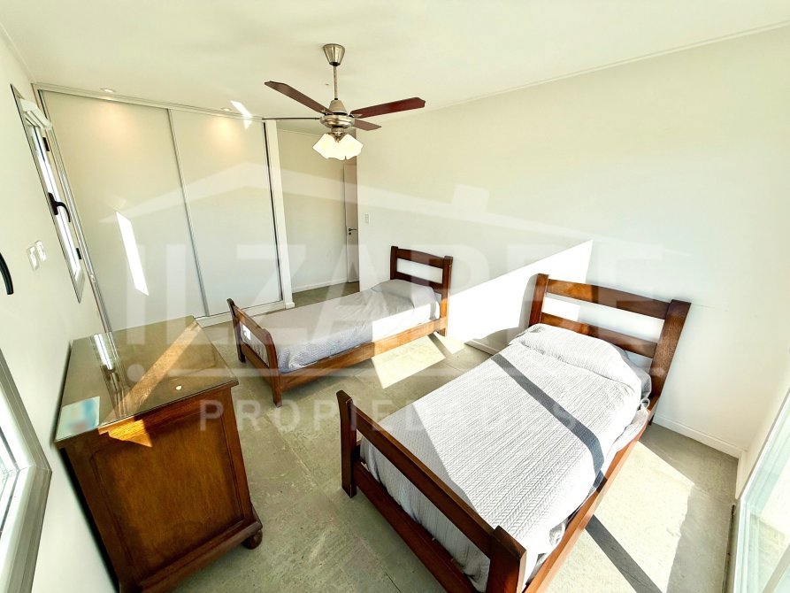Continuando por la planta alta, a la cual se accede mediante una escalera con descanso, se encuentran los otros dos dormitorios (sumando un total de 4 dormitorios). Por un lado, un dormitorio con aire acondicionado y balcón/terraza propia con orientación Oeste (hacia la calle). Por el otro, una suite principal que incluye: antebaño con lavatorio de apoyo marca Piazza, bajo mesada y placard de guardado; baño completo, equipado con lavatorio línea Ferrum, bidet, inodoro y ducha; vestidor con placares enfrentados a ambos lados; aire acondicionado; balcón/terraza privado con vistas abiertas al lago y la laguna.