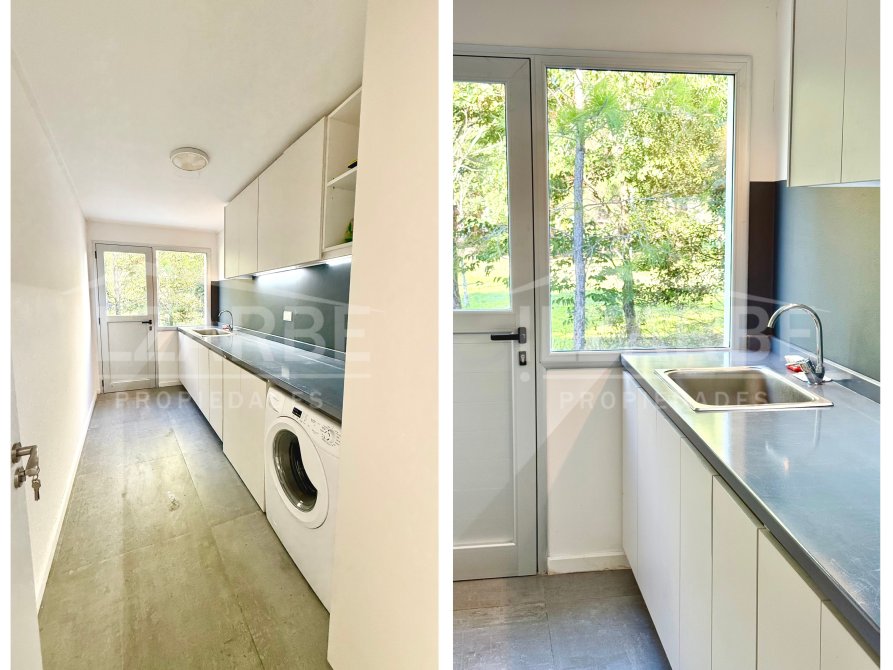 En cuánto al resto de la propiedad, en planta baja, continuando por un pasillo distribuidor, se encuentra un cuarto de guardado, lavadero (con amplia mesada con bacha), toilette (con fácil acceso al patio), y dos dormitorios. Ambos cuentan con placares empotrados, ventiladores de techo, y salida al exterior por puertas ventanas de aluminio.